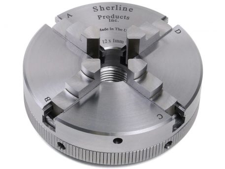 Turning the knurled portion of the outer diameter of the chuck scrolls all four jaws in unison. Included with the chuck are two Tommy bars for tightening and loosening the chuck. The spindle thread is 3/4-16 to fit all Sherline and similar spindles.