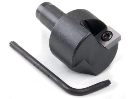This cutter has a #1 Morse tapered shaft and is held in the 3/4 x 16 headstock spindle with a drawbolt. The cutter comes with one 2-edged carbide insert, a Torx attachment screw, a drawbolt and washer, plus a T-15 Torx wrench. Additional inserts are available through Sherline as P/N 7622.