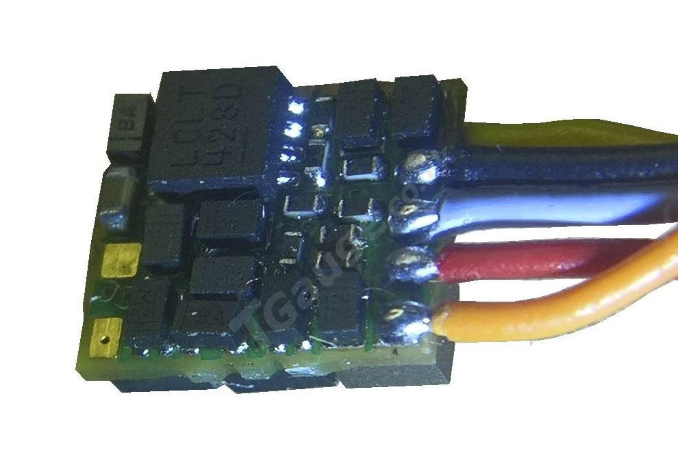 The DCX65 is only 6 x 5 x 1.8 mm in size and can therefore be installed in many Z, T and N locomotives without the need for elaborate milling work. The connecting wires are highly flexible color-coded stranded cables.
